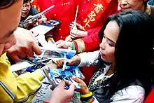 In 2012, she attended a charity auction in Beijing alongside her three children to auction a dress she wore during her performance at the 2008 Beijing Olympics. It sold for a record CNY ¥300,000 (US$42,800), and all proceeds were donated to charity.[77] In the same year, she was also appointed China's Oceanic Goodwill Ambassador by the China's Ministry of Natural Resources.[78]
