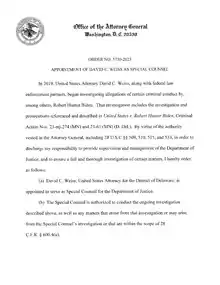 The Weiss special counsel investigation is an ongoing criminal investigation into Hunter Biden, the son of U.S. President Joe Biden. Attorney General Merrick Garland announced the appointment of Delaware United States attorney David Weiss as the special counsel on August 11, 2023, three days after Weiss requested such authority.