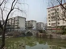 The Caohe Canal (foreground) and Ying'en Pavilion (center left) in the former Weiyang District