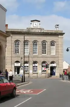 In 1814, the lord of the manor, the Duke of Wellington, agreed to grant a long lease to a group of local businessmen who intended to erect a new municipal building.[3] Their objective was to provide proper accommodation for the farmers' stalls which continued to block the highway.[4] The new building was designed in the neoclassical style, built in ashlar stone and was completed in 1833.[1] The building was originally open on the ground floor, so that markets could be held, with an assembly room on the first floor. The design involved a symmetrical main frontage with five bays facing onto Fore Street; there was an arcade of five round headed sash windows on the first floor and, at roof level, there was a cornice, a parapet and a small sculpted pediment containing a clock. Internally, the principal rooms were the assembly hall, which was used for concerts and public events, and a smaller room, which was used as a library and reading room by the Wellington Literary Institute.[5] The assembly room also became the venue for county court hearings.[6]