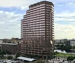 Wells Fargo Center, formerly the Wachovia Center, is a 311-foot (95 m) high rise in Tampa, Florida, U.S.A., anchored by Wells Fargo & Company, Phelps Dunbar and UBS.[3] It was completed in 1985 and has 22 floors. Under new ownership in 2013, the building is undergoing a renovation of the fitness center, parking garage and common areas including the restrooms and corridors. The building received Gold LEED certification in 2010. It was originally known as First Union Plaza until First Union Corporation completed its merger into Wachovia in 1993, then that merged into Wells Fargo in 2008. It is the 13th tallest building in Tampa.[4]