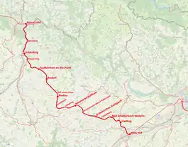 During the construction of the main line of Empress Elisabeth Railway, financial difficulties were encountered by the company. This caused a delay in the construction of the branch railway between Linz and Passau. The Bavarian Eastern Railway Company had already finished construction of the railway near the border, where the Austrian railway was supposed to be connected. On the other hand, the KEB had only undertaken project planning until the beginning of 1860. As a result, the terminus had to be changed to the Wels station because the line length was able to be shortened. The construction begann on 6 August 1860 and was completed by the KEB on 1 September 1861. It is an 81.2 km (83 km to the Passau freight yard) long double-track electrified main line. It runs through 79.6 km of Austrian territory and through 1.6 km of German territory, where it becomes the Regensburg–Passau railway in Passau station.[2]