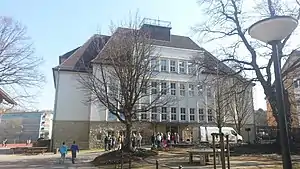 The school consists of three buildings: the main building, a building with rooms for science subjects ('Fachtrakt') and the old building in which the school took its beginning. The main building was inaugurated in 1928 and expanded in 1956.,[EV 1][WvS 1][WvS 2] In the same year, the gym was built. [WvS 3] The inauguration took place on 18 November 1957 in the presence of Dr. Friedrich August Knost, a representative of the district.[EV 1] In 1969 the school received its present name and the science building was inaugurated. [EV 2][WvS 4] Ten years later, this building was expanded by an additional floor. [EV 3] The auditorium was built between 1981 and 1982,[EV 3] a second gym was built in 1988 and 1989. It opened on 10 November 1989. Already the next day it served as a shelter for the East Germans arriving after the fall of the Inner German border. [EV 4] A cafeteria was set up in the main building in 1994. In 2009 construction began for a replacement, the newly built annex opened on 3 February 2010 [2] This new cafeteria offers a selection of warm lunch meals and a variety of snacks during the morning.