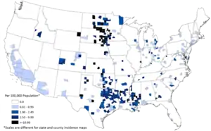 During the years between 1999 and 2010, an estimate of 3 million people have been infected in the United States. Highest incidence rates are observed in states of the central great plains, with South Dakota, Wyoming and North Dakota leading in incidence.[9]