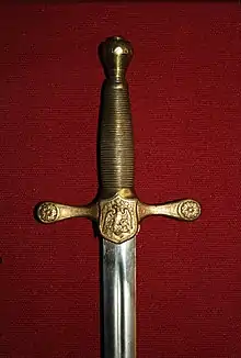 The Ames model 1850 seems to be the grandparent of this type of Academy sword. The Academy added specific heraldry to their sword starting in 1872. Other academies customized their swords, but now only 2 remain. The West Point-specific Cadet Sword is sold only to current cadets and alumni. The basic cadet sword might not be made from the same materials specified by the Academy and is sold without USMA heraldry, and can be purchased almost anywhere. The basic cadet sword has been or is made in Germany, India, Spain, and China, but not all swords are of the same quality. Variations of the sword are used at Virginia Military Institute[1] and other military academies and schools worldwide.[2]