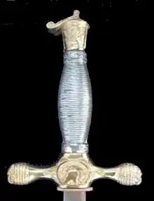 Closeup of the hilt bearing the Athenian helmet seal.