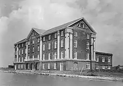 The renovations starting in 1937 were relatively minor on the exterior and major for the interior. The smokestacks were removed and a new entry was built on the east elevation. The ground level was rebuilt on a concrete slab. The gable brickwork was restored, but the brickwork was poorly matched. Demilune windows were put in the gables. Oculus windows were put in window openings on third level of the central gable on the west side. Cast-stone sills were installed in the first-floor windows. Only the first and second floors were completed.[3]
