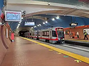 West Portal station is a Muni Metro station in the West Portal neighborhood in San Francisco, California. It is built around the western entrance to the Twin Peaks Tunnel. The station consists of two side platforms, with the entrance at the western end. A non-accessible footbridge connects the platforms inside fare control.