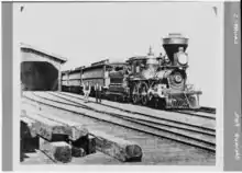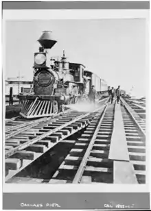 Two months later, the rail connection to the San Francisco and Oakland Railroad was finally in place, as was the expansion of CPRR's Oakland Pier.[13] On the morning of November 8, 1869, the first transcontinental train to use the expanded ferry terminal at Oakland Pier traversed the SF&O and the Western Pacific Railroad to reach Sacramento, and continue eastward on the Central Pacific Railroad. The city of Oakland held a large celebration later in the day to greet the first westbound transcontinental train.[34]