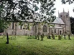 The limestone parish church is a Grade I listed building dedicated to Saint Mary and dates from 1170. It was restored by George Gilbert Scott between 1858 and 1867, and by J. L. Pearson 1885–56. It has a 15th-century west tower, and the font dates from 1200.[9] The lychgate is a Grade II listed war memorial erected in 1918 of red brick and wood.[10] The churchyard cross is also Grade II listed and a scheduled monument, being medieval in origin with modern additions.[11]