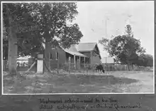 On Saturday 6 September 1919, John Huxham, the Queensland Home Secretary opened the Westwood Sanatorium,[14][15] a 64-bed sanitorium was opened in Westwood to treat miner's phthisis,[16] a lung disease suffered by miners from working in dusty conditions. Later, it treated patients with tuberculous. In 1953, a ¾ mile bitumen road was built from the Huxham railway siding (just to the north of Westwood) to the sanitorium and named Haigh Drive in memory of Leonard Garfield Haigh, the former chairman of the Rockhampton Hospitals Board from 2 June 1933 to 16 February 1953. Commencing with a tiled-roof waiting shed at the siding with a plaque commemorating Haigh, the drive to the sanitorium was flanked with Peltophorum trees and was officially opened by James Larcombe (MLA for Rockhampton) in the presence of Haigh's widow on Sunday 1 November 1953.[17][18] More effective medical treatments for tuberculous resulted in the closure of the sanitorium in 1959, but the building continued to be used as a nursing home until the 1980s. The sanitorium buildings were then relocated or demolished; one is in use as a private home in Emerald.[19]