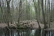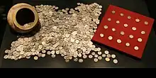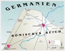 The end of the Wetterau Limes came in the year 259-260 AD, when Rome abandoned all areas to the east of the Rhine (the Limesfall or "fall of the limes"). Thus, for example, the pottery trade, once flourishing in the Wetterau, largely came to a standstill. Imports of pottery from the Rhineland dominate archaeological collections from the second third of the 3rd century. Even bricks found in the area do not seem to have been fired as they used to be. More and more often, (sometimes damaged) older building material was used instead. Hypocaust heating was replaced by much simpler heating pipe systems.[5] From the border area, however, there are also other interesting finds which shed further light on the later period of the limes. This includes the treasure of Ober-Florstadt, which was probably concealed during the course of Germanic invasions in AD 233. In 1603, the inscription of a collegium iuventutis was discovered in the area around Altenstadt Roman Fort.[6] This may have been a unit set up to act as a local militia. Kapersburg Roman Fort was considerably reduced during its last days.[7] There is also evidence of a local unit, a numberus nidensium, which was presumably raised in the civitas capital of Nida-Heddernheim.[8]