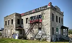 North face, with the rooftop "ASYLUM" sign remnant from having been a Halloween haunted house attraction in the 1980s-1990s