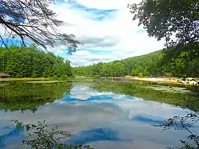 The Great Depression of the 1930s was a boom time for the construction of state park facilities all over Pennsylvania and Whipple Dam was no exception. Unemployed young men were put to work by the Civilian Conservation Corps and cleared streams of brush, planted many acres of trees in a reforestation effort, built bridges on state roads and cleared roads through the forests for fire prevention. The CCC also built the facilities that are still in use today at Whipple Dam State Park. In 1935, they dismantled the 1928 dam and built a new one. They also built pavilions, restrooms, roads and the beach. Their work was placed on the National Register of Historic Places in 1987.[1]
