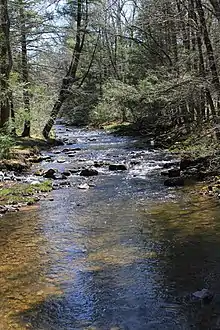 White Deer Creek is a freestone stream.[11] There are numerous strainers on White Deer Creek, to the point where the creek was described as "one of the most tree-infested and strainer-struck streams in the state".[13] The creek's channel is also braided in some reaches.[13] The creek flows through a very narrow valley and, in its upper reaches, is small for a canoeing stream.[13][14] The community of White Deer experiences significant flooding problems because it is on the creek's floodplain, and because of the creek's narrow valley.[14] The topography of the watershed is mountainous, with the creek's narrow valley being surrounded by steep ridges.[15] The watershed was described as rugged, with sharp topographical features, in a 1938 report. The watershed is not affected by glaciation, as it is approximately 30 miles (48 km) south of the glacial moraine.[12]