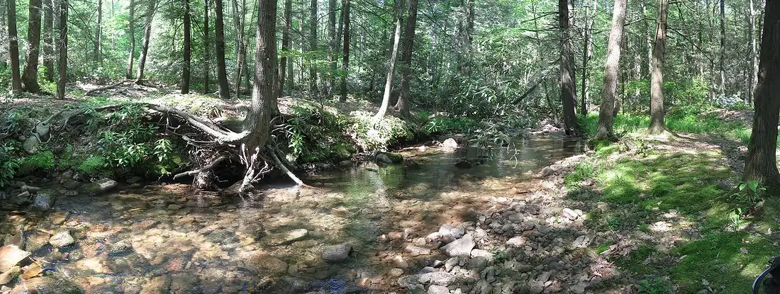 Panorama of the creek and surrounding state forest in Washington Township, just downstream from Cove Road and the confluence with the Fourth Gap tributary