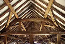 The timber roof of the building is thought not to be the original. It is 16th century and locally-made.[19] It is likely that it was taken from another, similar building also bought by John Hales after the Dissolution of the Monasteries.[20]