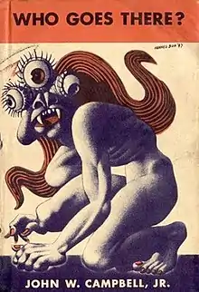 Who Goes There? is a collection of science fiction stories by American writer John W. Campbell Jr. It was published in 1948 by Shasta Publishers in an edition of 3,000 copies, of which 200 were signed by Campbell. The 1951 film The Thing from Another World, and 1982 version The Thing by John Carpenter, are based on the title story. The stories originally appeared in the magazine Astounding SF under Campbell's pseudonym Don A. Stuart.