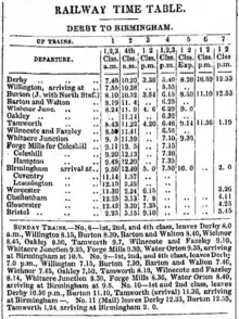 The South Staffordshire Railway opened their South Staffordshire line from Walsall to Wichnor Junction for passenger traffic on 9 April 1849. Initially they had an agreement with the Midland Railway for running powers over the line through to Burton upon Trent, but a deterioration in relations in 1853 led to the Midland revoking the running powers forcing the construction of a new station at Wichnor for the interchange of passengers and goods.[2]