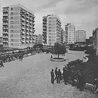 The large panel system-buildings of the neighbourhood of Skarpa Puławska, as seen from Puławska Street, in the 1960s.