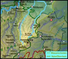 ![]() Map of the catchment area (excluding the mouth) of the two parallel Donnersberg streams: the Wiesbach (right) and Appelbach (left) | |