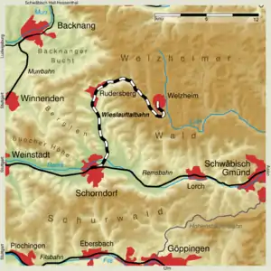 The Wieslauf Valley Railway (German: Wieslauftalbahn) is a branch line in the Stuttgart region of the German state of Baden-Württemberg. It is single-track and standard gauge, and was originally 22.8 km (14.2 mi) long, connecting the main Remsbahn line at Schorndorf to Welzheim. Today it is operated in two sections, with the first 11.5 km (7.1 mi) from Schorndorf to Rudersberg served by a regular passenger service, whilst the final 11.3 km (7.0 mi) forms a steam operated heritage railway.[1]