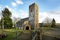 The nave and north and south aisles of the Church of England parish church of Saint Giles were built late in the 13th century.[5] The chancel is early Decorated Gothic, built in about 1300.[6] Each aisle is linked with the nave by an arcade of three bays.[5] The Perpendicular Gothic porch and west tower were added in the 15th or late 14th century.[5] The nave clerestory is also a Perpendicular addition.[5] The tower and the clerestory are crenellated.[5] Monuments in St Giles include some early 14th century effigies in the chancel: of a recumbent knight on the north side, and of a civilian with two wives or daughters on the south.[7]