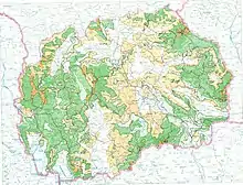 North Macedonia spans 25,713 square kilometres (9,928 sq mi) in the middle of the Balkan Peninsula.[1] The landlocked country is centred around the Vardar river valley, with the national borders being marked by mountain ranges.[2] Its diverse landscape creates a variety of local climates, which can be divided into eight biomes. The varied habitats of the country, including both natural and man-made environments, can be divided into 28 broad types,[1] which are further subdivided into 120 at the third level of EUNIS classification. These are spread across 38 classes of landscapes.[3]