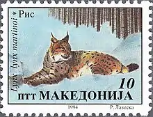 The Balkan lynx persists around the Albanian-Macedonian border. Its low population leads it to being rarely seen, and it is the subject of recovery efforts. The lynx has a reputation for killing livestock, despite there being very few recorded incidents.[14] There are perhaps fewer than 100 spread across North Macedonia and Albania.[4] Brown bears live in mountainous forests in the west of the country. Around 160-200 individuals inhabit these forests, part of the larger Dinaric-Pindos population.[15] About 70 are found in Mavrovo National Park.[4] The population of wolves numbered around 800–1000 as of 2013.[16]