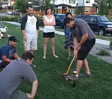 The championship match was 6-wicket Oxford style, modified to squeeze into the backyard pitch of host Colin and Katherine Olson's West Kelowna home. Nickel jumped out to an early lead, but was surpassed midway through the course by Wile. The close quarters and out-of-bounds hazards kept players modest, and no lead seemed insurmountable. Though the competitors had an “Anybody-But-Brian” mentality going into the match, Martin was trailing behind when the unexpected occurred.