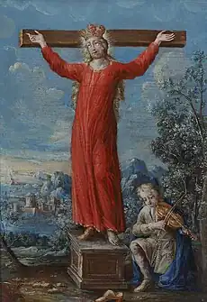 She is often shown with a small fiddler at her feet, and with one shoe off. This derives from a legend, also attached to the Volto Santo of Lucca, of a silver shoe with which the statue had been clothed dropping spontaneously at the feet of a poor pilgrim. In Wilgefortis's version, the poor devotee became a fiddler, perhaps in the 13th century.[16][17][18][19]