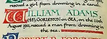 He was honoured on numerous occasions in recognition of his outstanding life saving record. In 1906 the mayor of Great Yarmouth presented William Adams with an illuminated address. The testimonial, signed by 90 subscribers, stated that he had saved 77 lives up to that time.[7]
