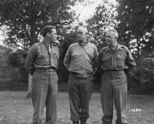 Lieutenant General Omar Bradley, center, Commanding the U.S. 12th Army Group, confers with Major General Elwood Richard Quesada, left, and Major General William B. Kean at 1st U.S. Army Headquarters, 3 miles east of Le Tilleul, France.