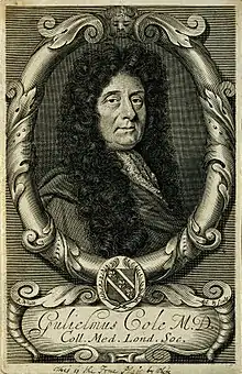 William Cole, born in 1635, was educated at Gloucester Hall, Oxford, as a member of which society he graduated MB on 7 August 1660, and MD on 9 July 1666.[1] He practised first at Worcester, where, as appears from his writings, he was consulted by persons of distinction, and was probably successful. From Worcester he wrote in 1681 to Sydenham (though personally unknown to him) the letter which called forth the latter's well-known Dissertatio Epistolaris. The personal reference to Cole in this work shows that he was already well known by his medical writings. About 1692 he removed to London, and was admitted 26 June 1693 a candidate, and 25 June 1694 a fellow of the College of Physicians. Some time before his death he appears to have retired to the country. He died on 12 June 1716, and was buried at Allesley, near Coventry, where his grave with memorial inscription still exists.[2] His portrait, drawn and engraved by Robert White, adorns some of his books.[3]