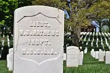 Matthews had two sons, John D. and Joseph Edward, each of whom died in the late 1890s.[18] Matthews died March 2, 1906, at his home in Leavenworth.[19] His funeral was at the Kiowa Street African Methodist Episcopal Church, he was buried in Mount Muncie Cemetery,[20] but his body was moved to the Soldier's Home Cemetery in 1908.[21]