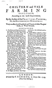 Chiltern and Vale Farming explained forms an octavo volume of 400 pages ; and treats the cropping of sour clay lands, with the common grain and leguminous plants; the natural and artificial grasses; ploughing in general; seeds; weeds; liquor for a corn steep; horse-hoeing; turnips, use and value; manures in general. The wheel-plough, with two mould-boards, is figured and largely described ; and the author seems very fond of its supposed value. The management of the works is confused; the planting of oak and fruit trees being introduced in the very middle of a book on arable lands.[2]