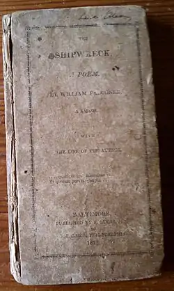 The Shipwreck, an epic poem written by William Falconer. The edition depicted above was printed in 1813 in Philadelphia, while the first edition was printed in 1762.