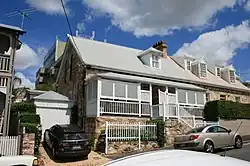The verandah sits at half level above Gloucester St, and is accessed via stone stairs. It has timber rectangular columns with timber capitals, and an unpainted timber boarded ceiling. The dormer above has a hipped roof, and the half-round guttering is decorated with cresting at the corners. A sandstone and brick chimney rises above the roofline. The windows are multi-paned timber sliding sash windows, and have textured sandstone lintels, quoins and sills; the doors also have textured sandstone surrounds. The eastern attic window is flanked by two timber rails which may have been a lifting device. The rear wing has a hipped corrugated iron roof which adjoins that of its neighbour. A small brick and corrugated iron outhouse sits to the west of the kitchen.[1]