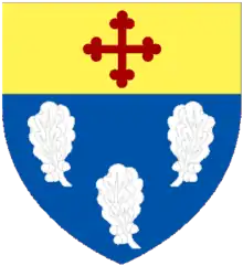 Azure three oak leaves Argent on a chief Or a cross bottony Gules.