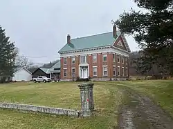 The William Hayden House stands on the west side of Vermont Route 14, between Wylie Hill Road and Route 14's crossing of the Rogers Branch of the Black River. It is a 2+12-story brick building, with a side gable roof, end chimneys, and granite foundation. It is set back from the road, accessed by a semicircular drive, with a low granite wall paralleling the road. The driveway entrances are marked by carved stone posts, as is a pedestrian entrance at the center of the semicircle. The house's main block has a five-bay front facade, articulated by brick pilasters with granite capitals. Windows are rectangular sash, set in openings with granite sills and lintels. The window above the entrance is a three-section window, with narrow side windows in the Palladian style. The entrance is recessed in a rectangular granite-lined openings, with flanking sidelight windows and round columns, and a large transom window above. Below the roofline is a tall entablature, and an eave decorated with drop pendants. A single-story brick ell, reproducing one destroyed by fire, extends to the south, joining the house to a 20th-century garage.[2]