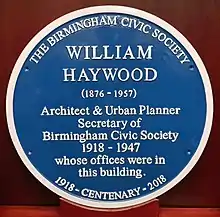 On 2 November 2018, the Birmingham Civic Society unveiled a blue plaque to Haywood, which is located on the site of his practice offices at 37 Bennett's Hill, Birmingham. At that time the Chairman of the Society announced the inauguration of the William Haywood Prize for exceptional architectural or planning contribution to the City of Birmingham.