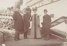 Four people including Goodyear in front of a ship. Possibly taken before or after 1901 survey expedition.