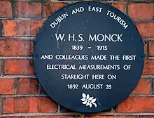 In 1892, Monck, George F. Fitzgerald, and his neighbour S.M. Dixon created the first electrical measurements of starlight using photovoltaic cells which were made by George M. Minchin.[8] These measurements were taken from a telescope in his back garden. A plaque to honour the location of the first electric measurements of starlight was unveiled at 16 Earlsfort Terrace on 6 April 1987.[9]