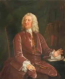 King thought himself badly treated in the course of his Irish lawsuit, and attacked his enemies in a mock-heroic poem, in two books, called The Toast (alleged to have been originally composed in Latin by a Laplander, "Frederick Scheffer", and translated into English, with notes and observations, by "Peregrine O'Donald, Esq.") The heroine, "Mira", is the Countess of Newburgh, who had secretly married as her third husband Sir Thomas Smyth, King's uncle.[2] King portrayed her as a lesbian.[14][15] It was published at Dublin in 1732. Swift praised it, and The Toast was completed in four books, inscribed to him, and printed in London (1736), with a frontispiece by Hubert-François Gravelot (engraver Bernard Baron);[16] it was reissued in 1747. In his old age King regretted many passages, and at his death the remaining copies were burnt. The poem was reissued without the annotations in John Almon's New Foundling Hospital of Wit. A key to the characters is given in William Davis's Second Journey round the Library of a Bibliomaniac (1825).[2]