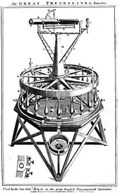 The main survey instrument from 1802 for the primary triangles was a Great Theodolite made by William Cary. This was very similar to the instruments used in France and Britain for previous trigonometrical surveys. It had a horizontal circle that was 36 inches (91 cm) and the readings were taken using a microscope. The vertical graduated circle was 18 inches (46 cm) in diameter.[9] It weighed about half a ton and needed twelve men to carry it. Lambton measured all three angles of triangles in several cases to establish the spherical excess (angles of triangles on a sphere sum up greater than 180°). When the survey was carried out from Madras to Bangalore, Lambton was able to compare the Bangalore baseline of 1804 with the calculated measurements and the difference was about 3.5 inches (8.9 cm).[14]