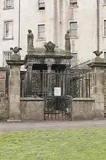 He is now mainly remembered for this elaborate stone tomb in Greyfriars Kirkyard, which was completed in 1683 and is one of the most distinctive in the graveyard. The tomb shows Little lying recumbent, propped by his elbow, under a canopy supported on six Corinthian columns and topped by two female figures (representing Lady Justice and Prudence).[10] Documents mention four figures on the tomb, representing moral virtues.[11]