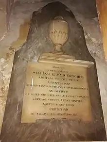 William died in 1796 and was buried in the St. Cadog's church along with his father John and grandfather Thomas, both of whom were High Sheriffs of Carmarthenshire.[20] William's father John created a monument in St. Cadog's church to his parents Thomas (d. 1720) and Rachel Lloyd (d.1702).[12] William's godchild John William Lloyd commissioned another monument in the St. Cadog's church for his son John Philipp Lloyd (d. 1849).[20][21]