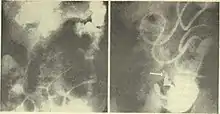 The Miller–Abbott tube was introduced in 1934 and was used to sample gastrointestinal fluid. It helps with diagnosing and treating by compressing the obstructive matter found in the small intestine. This roughly 3 meter (9.8 feet long) double-channel intestinal tube is with an inflatable balloon at its distal end, is used for diagnosing and treating obstructive lesions of the small intestine. The tube is inserted via a nostril and gently passed through the stomach and into the small intestine.[5] Still largely unchanged in 2011, once this instrument weaves down the esophagus and into the stomach, the tube is capable of a handful of jobs at this point, from suctioning gastric juices for testing and irrigation to ballooning open the entryway to the small intestine, called the duodenum, for clearer radiology testing and easier removal of many intestinal blockages.[5] The Miller-Abbott tube is named after American gastroenterologists William Osler Abbott and Thomas Grier Miller. These doctors also pioneered the surgical procedures that set the stage for easier diagnosis and removal of stomach and intestinal lesions, blockages and ulcers.[6] With the instrument having its double-barreled design, one of the pipes, called a lumen, is responsible for pumping up a thin balloon at the tip for easy exploration into the intestines at the duodenum. The other lumen tube can then suction fluids out or pump fluids in, depending on the procedure. For radiology, a barium solution can be pumped into the duodenum to isolate potential damage and produce clear images of it. Allowing the tube to proceed into the intestines also might help dislodge identified blockages causing pain or digestive disorders. In 2011, the Miller-Abbott tube might be accompanied by another, called a laparoscope. This latter tube combines a light and camera to give physicians a three-dimensional, colored view of whatever blockage is occurring. It can also help the doctor know exactly when the Miller-Abbott tube's balloon is at the perfect location in the duodenum — a process that depends on the slow and steady peristaltic contractions of the digestive tract.[6]