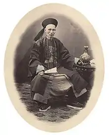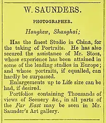 Saunders was born in Britain in 1832, and first travelled to China in 1860 as an engineer.[4] He then returned to Britain, studied photography, and returned again to China with photographic equipment, where he opened one of Shanghai's first photography studios in January 1862.[3] Located near the famous Astor House Hotel at the centre of Shanghai's commercial hub, Saunders' studio became the city's leading photographic studio.[5] Saunders' studio was to remain open for twenty-five years, a testament to his "considerable photographic talent [combined] with business acumen and marketing flair."[6] Although chiefly a portrait photographer, Saunders' fascination with China led him to photograph current events, local scenery and the local population.[7]