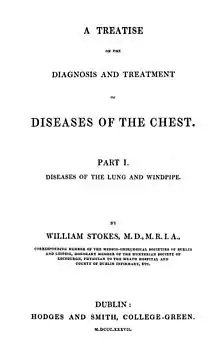 William Stokes (1 October 1804 – 10 January 1878) was an Irish physician, who was Regius Professor of Physic at Trinity College Dublin. He graduated from the University of Edinburgh Medical School with an MD in 1825 later returning the practice in Dublin at Meath Hospital. He went on to create two important works on cardiac and pulmonary diseases – A Treatise on the Diagnosis and Treatment of Diseases of the Chest (1837) and The Diseases of the Heart and Aorta (1854) – as well as one of the first treatises on the use of the stethoscope. He emphasised the importance of clinical examination in forming diagnoses, and of ward-based learning for students of medicine.